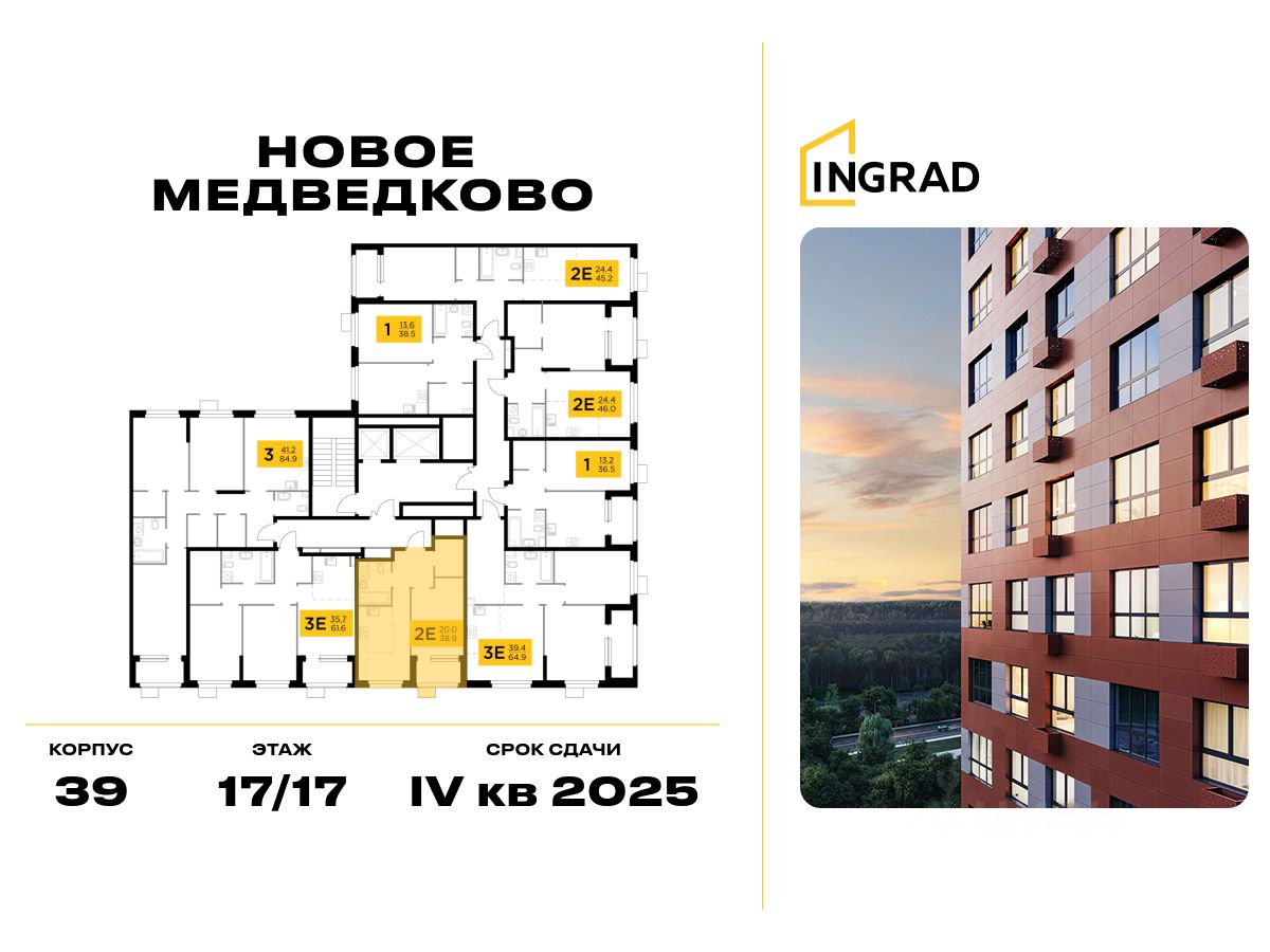 Прямая продажа от застройщика. В жилом квартале, расположенном в северо-западной части города Мытищи, продаётся 1-спальная квартира площадью 38.90 кв.м без отделки. Квартира расположена на 17 этаже 17-этажного дома, корпус 39, в жилом квартале комфорт-класса Новое Медведково (застройщик ГК Инград).