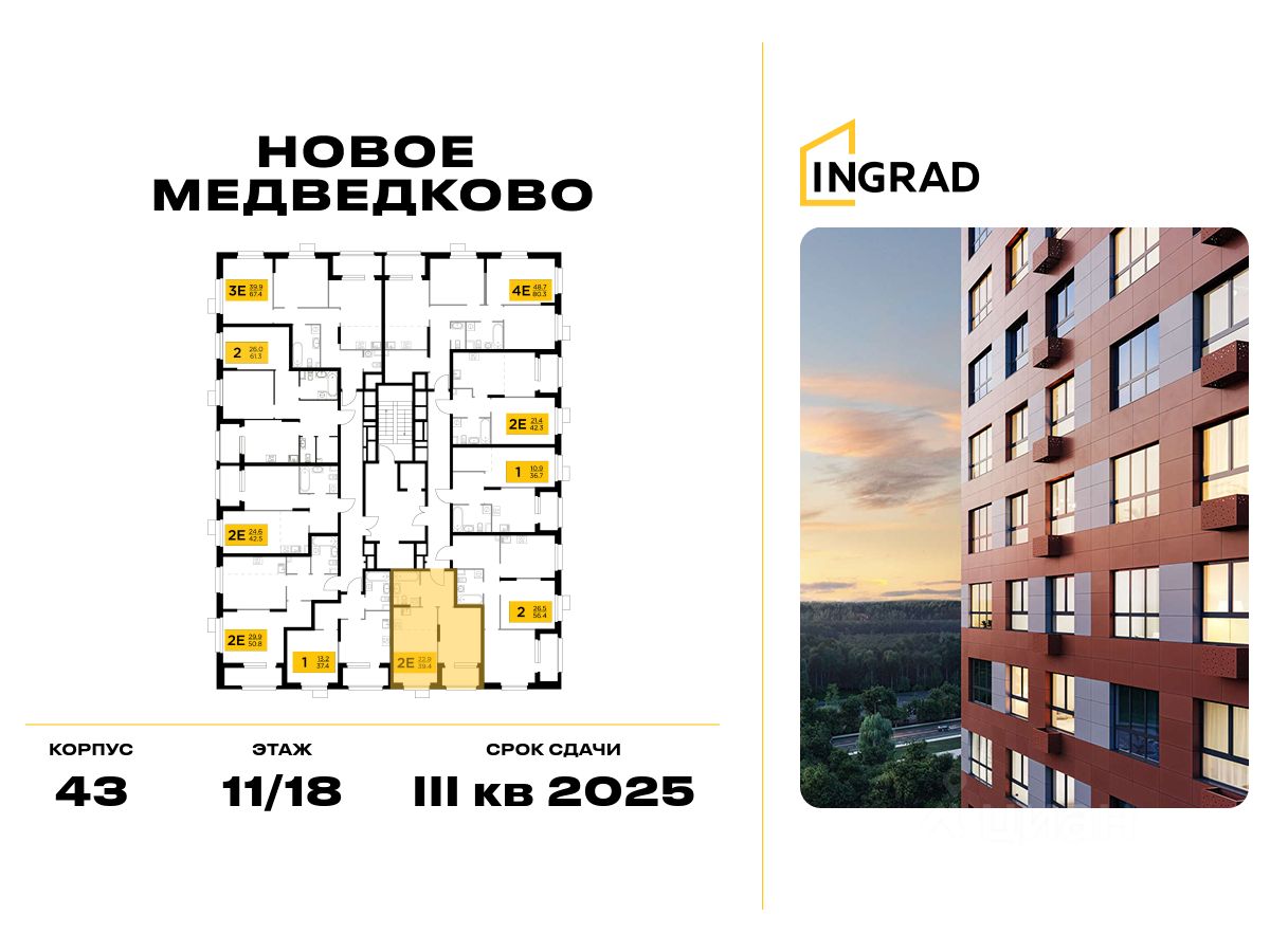 Прямая продажа от застройщика. В жилом квартале, расположенном в северо-западной части города Мытищи, продаётся 1-спальная квартира площадью 38.10 кв.м без отделки. Квартира расположена на 11 этаже 18-этажного дома, корпус 43, в жилом квартале комфорт-класса Новое Медведково (застройщик ГК Инград).