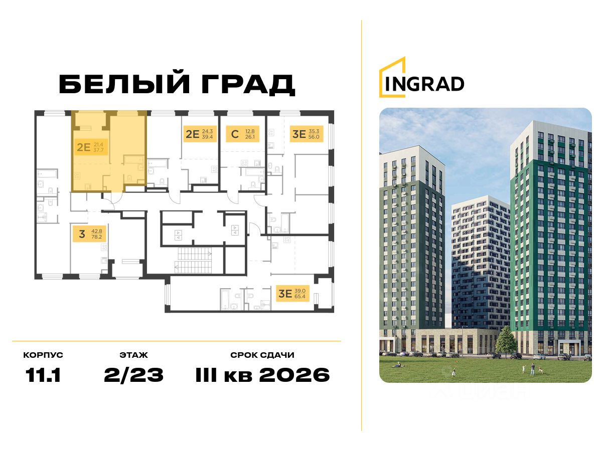 Пряма продажа от застройщика. В жилом квартале комфорт-класса "Белый Град" (застройщик ГК Инград) продаётся 1-спальная квартира площадью 37.70 кв.м без отделки. Квартира расположена на 2 этаже 23-этажного дома, корпус 11.1.