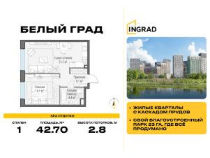 Пряма продажа от застройщика. В жилом квартале комфорт-класса "Белый Град" (застройщик ГК Инград) продаётся 1-спальная квартира площадью 42.70 кв.м без отделки. Квартира расположена на 12 этаже 17-этажного дома, корпус 11.1.