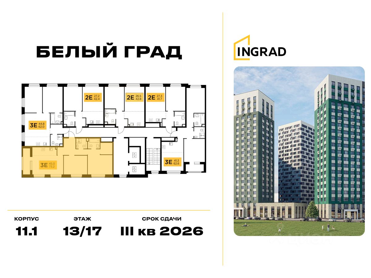 Пряма продажа от застройщика. В жилом квартале комфорт-класса "Белый Град" (застройщик ГК Инград) продаётся 2-спальная квартира площадью 73.20 кв.м без отделки. Квартира расположена на 16 этаже 17-этажного дома, корпус 11.1.