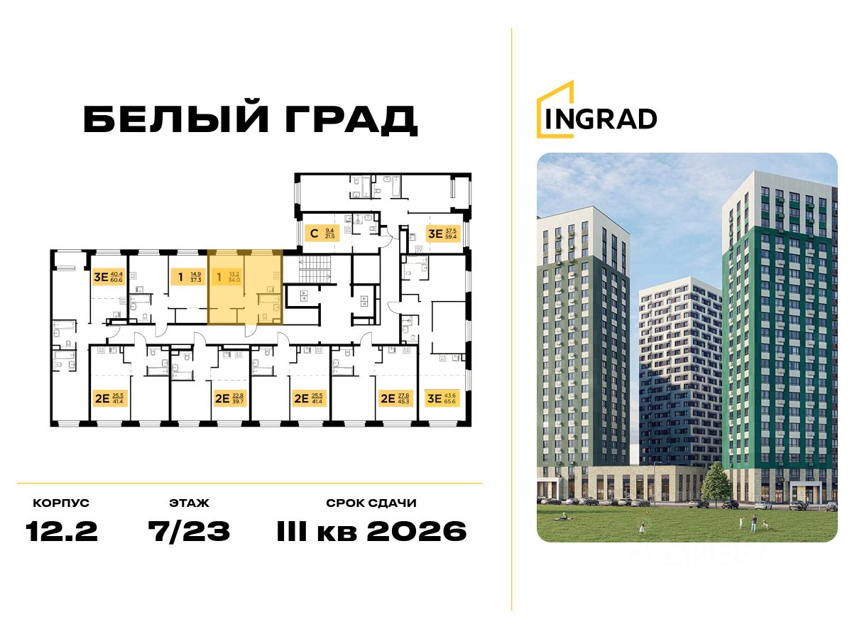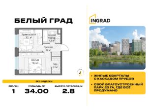 Пряма продажа от застройщика. В жилом квартале комфорт-класса "Белый Град" (застройщик ГК Инград) продаётся 1-спальная квартира площадью 34.00 кв.м без отделки. Квартира расположена на 10 этаже 23-этажного дома, корпус 12.2.
