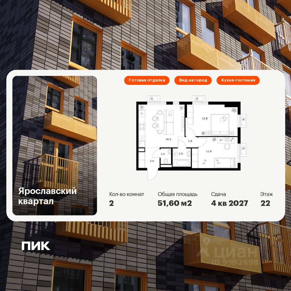 Продаётся 2-комн. квартира площадью 51,6 кв.м на 22 этаже 25 этажного дома (Корпус 2.2, Секция 1) проекта ПИК Ярославский квартал. Светлый просторный подъезд на уровне земли, функциональная планировка, большие окна, c отделкой.