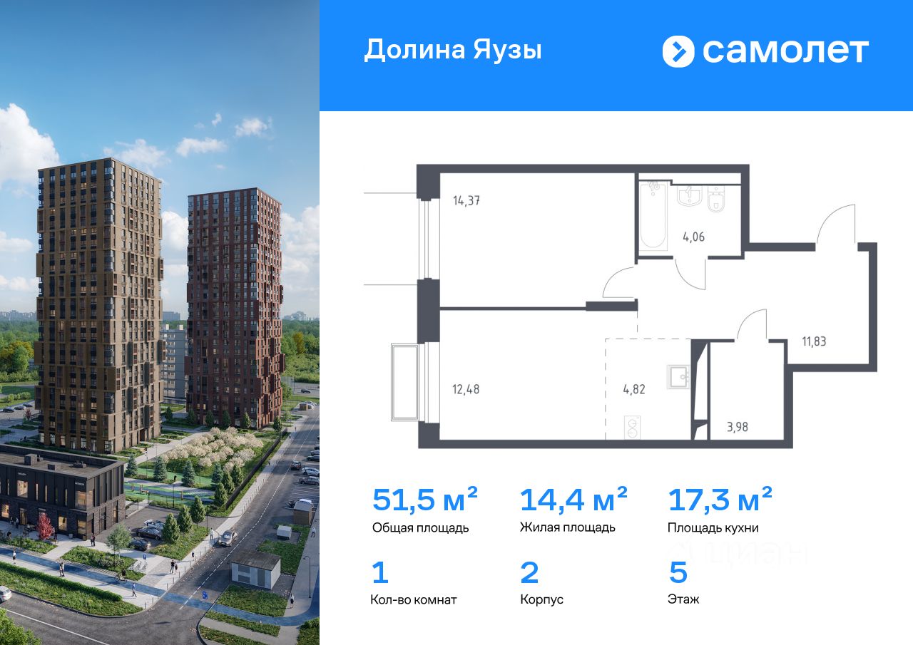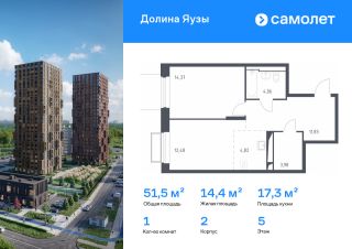 Строим кварталы для жизни с заботой о будущем. Предлагается 1-комнатная квартира комфорт-класса 51,54 кв.м в корпусе 2 на 5 этаже, в ЖК "Долина Яузы"