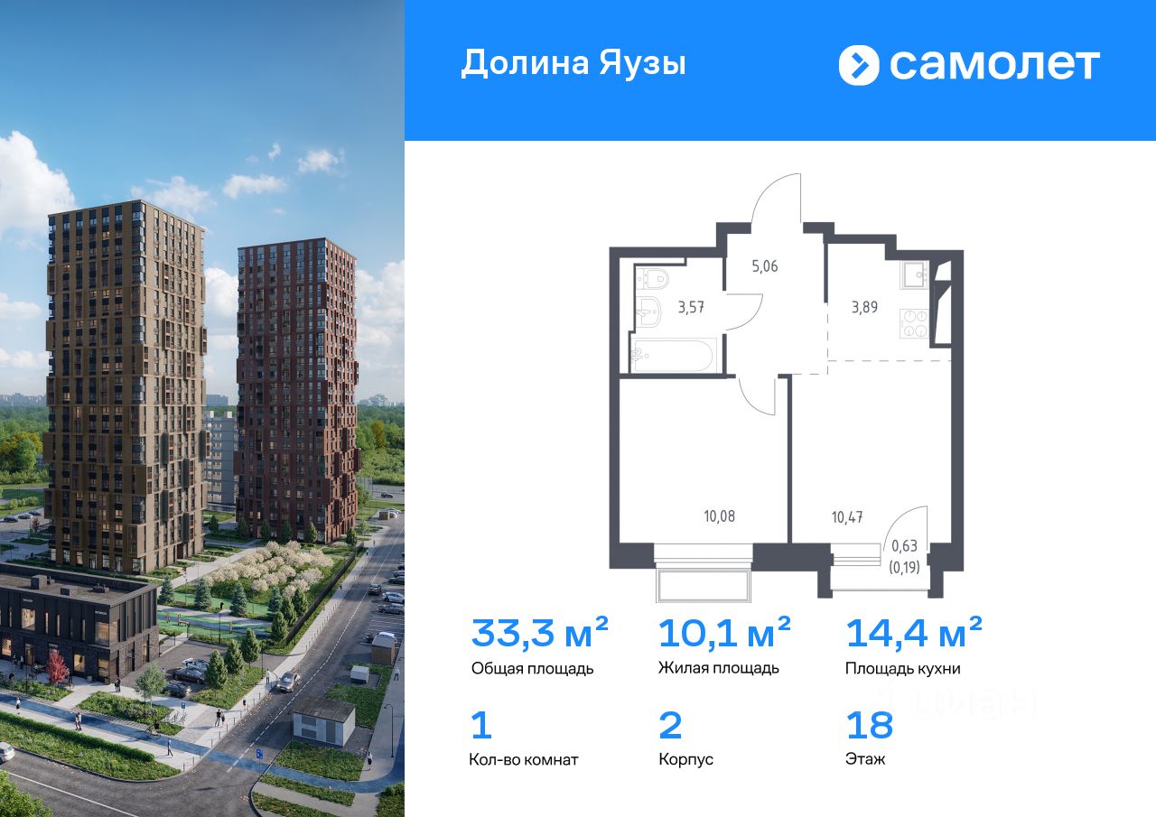 Строим кварталы для жизни с заботой о будущем. Предлагается 1-комнатная квартира комфорт-класса 33,26 кв.м в корпусе 2 на 18 этаже, в ЖК "Долина Яузы"