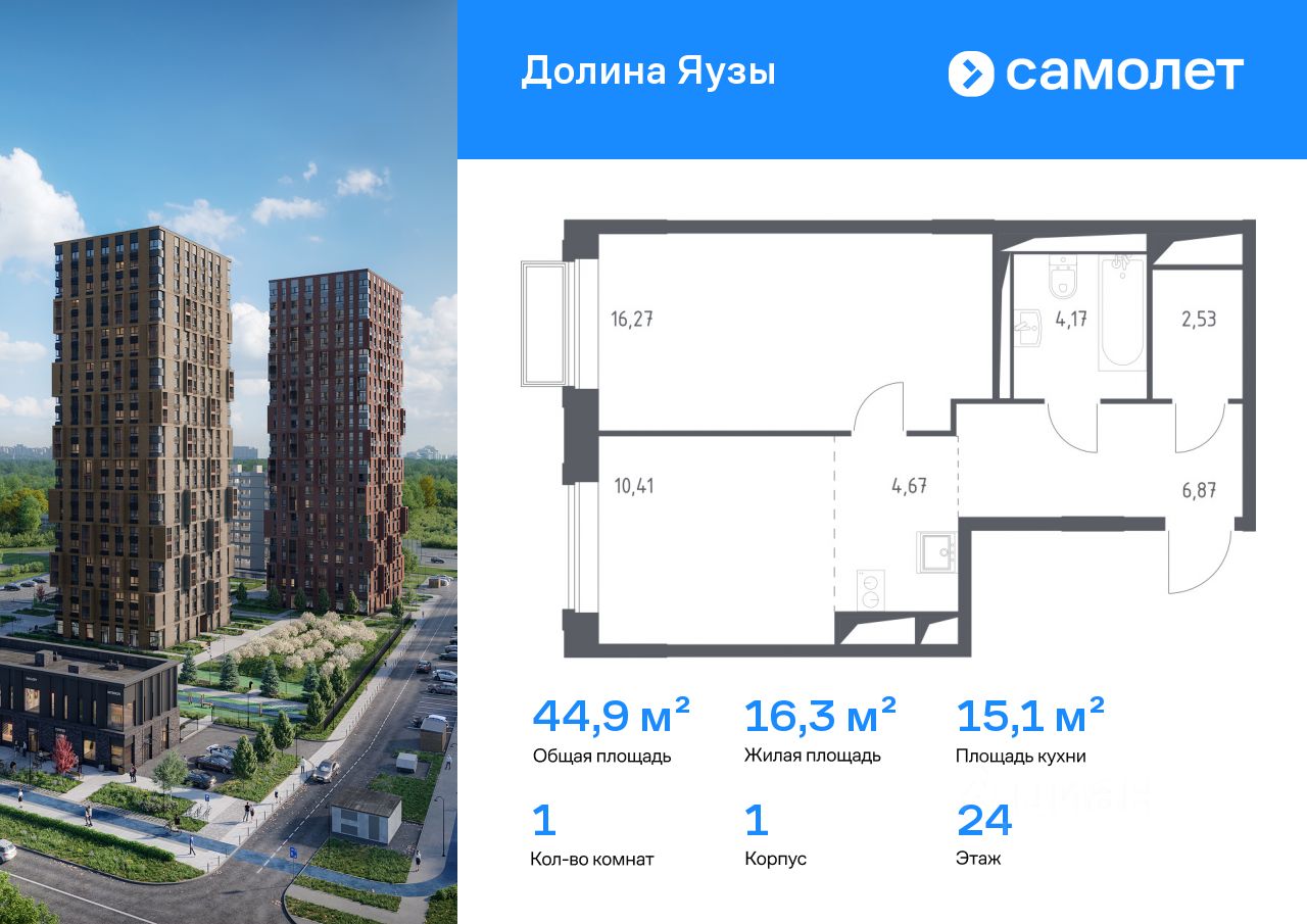 Строим кварталы для жизни с заботой о будущем. Предлагается 1-комнатная квартира комфорт-класса 44,92 кв.м в корпусе 1 на 24 этаже, в ЖК "Долина Яузы"