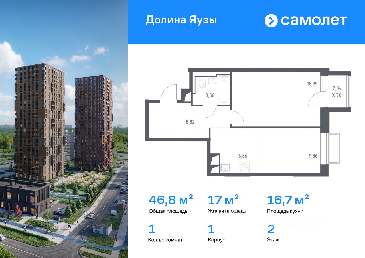 Строим кварталы для жизни с заботой о будущем. Предлагается 1-комнатная квартира комфорт-класса 46,79 кв.м в корпусе 1 на 2 этаже, в ЖК "Долина Яузы"