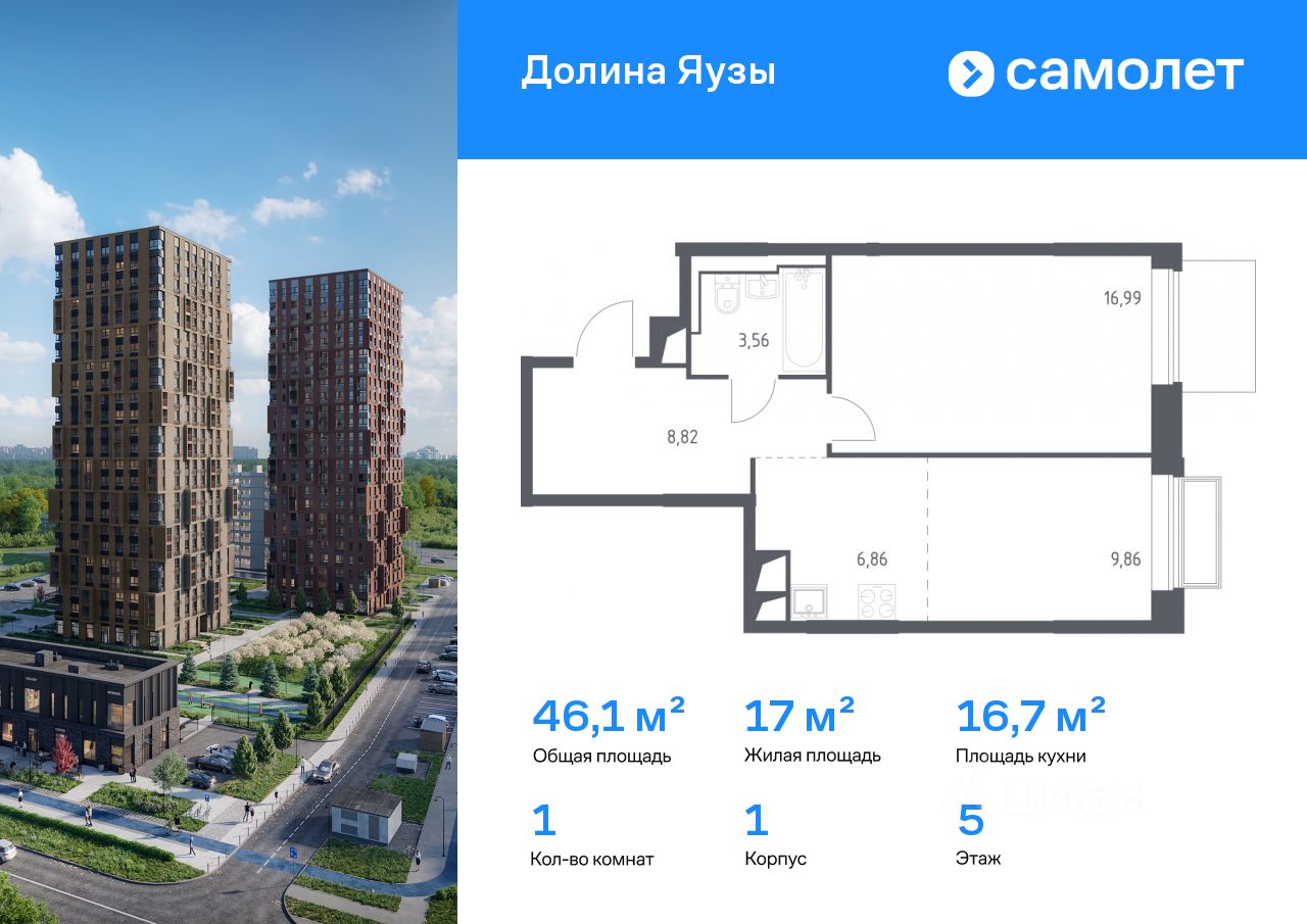 Строим кварталы для жизни с заботой о будущем. Предлагается 1-комнатная квартира комфорт-класса 46,09 кв.м в корпусе 1 на 5 этаже, в ЖК "Долина Яузы"