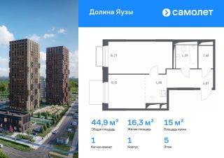 Строим кварталы для жизни с заботой о будущем. Предлагается 1-комнатная квартира комфорт-класса 44,94 кв.м в корпусе 1 на 5 этаже, в ЖК "Долина Яузы"