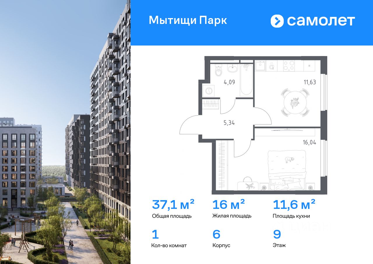 Строим кварталы для жизни с заботой о будущем. Предлагается 1-комнатная квартира комфорт-класса 37,1 кв.м в корпусе 6 на 9 этаже, в ЖК "Мытищи Парк"
