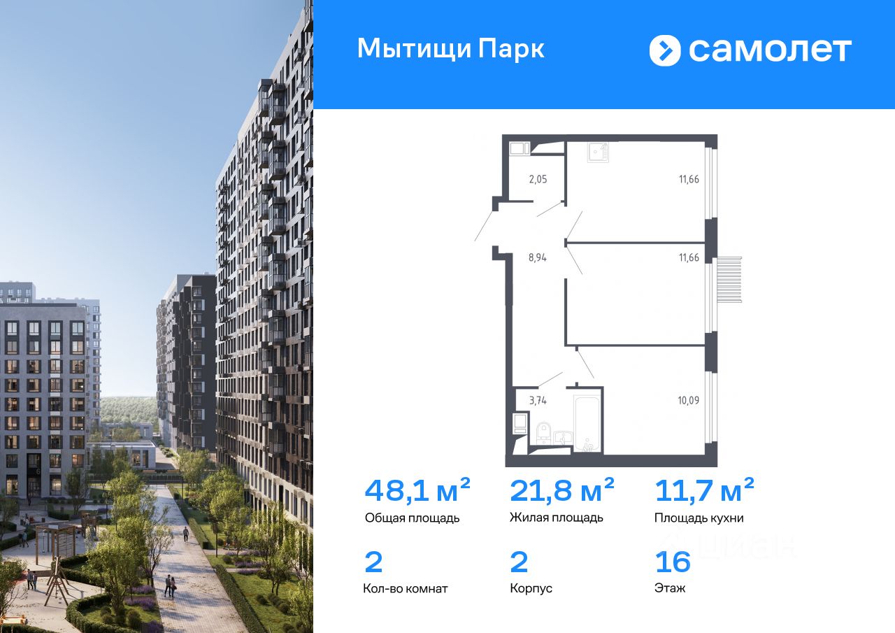 Строим кварталы для жизни с заботой о будущем. Предлагается 2-комнатная квартира комфорт-класса 48,05 кв.м в корпусе 2 на 16 этаже, в ЖК "Мытищи Парк"