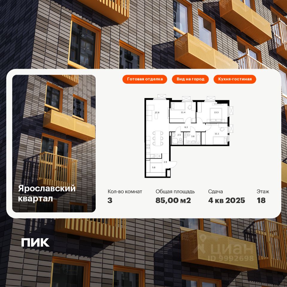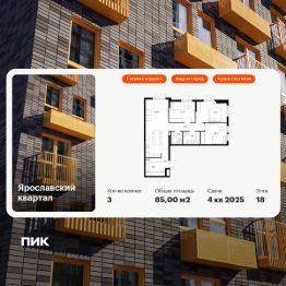 Продаётся 3-комн. квартира площадью 85 кв.м на 18 этаже 25 этажного дома (Корпус 1.1, Секция 1) проекта ПИК Ярославский квартал. Светлый просторный подъезд на уровне земли, функциональная планировка, большие окна, c отделкой.