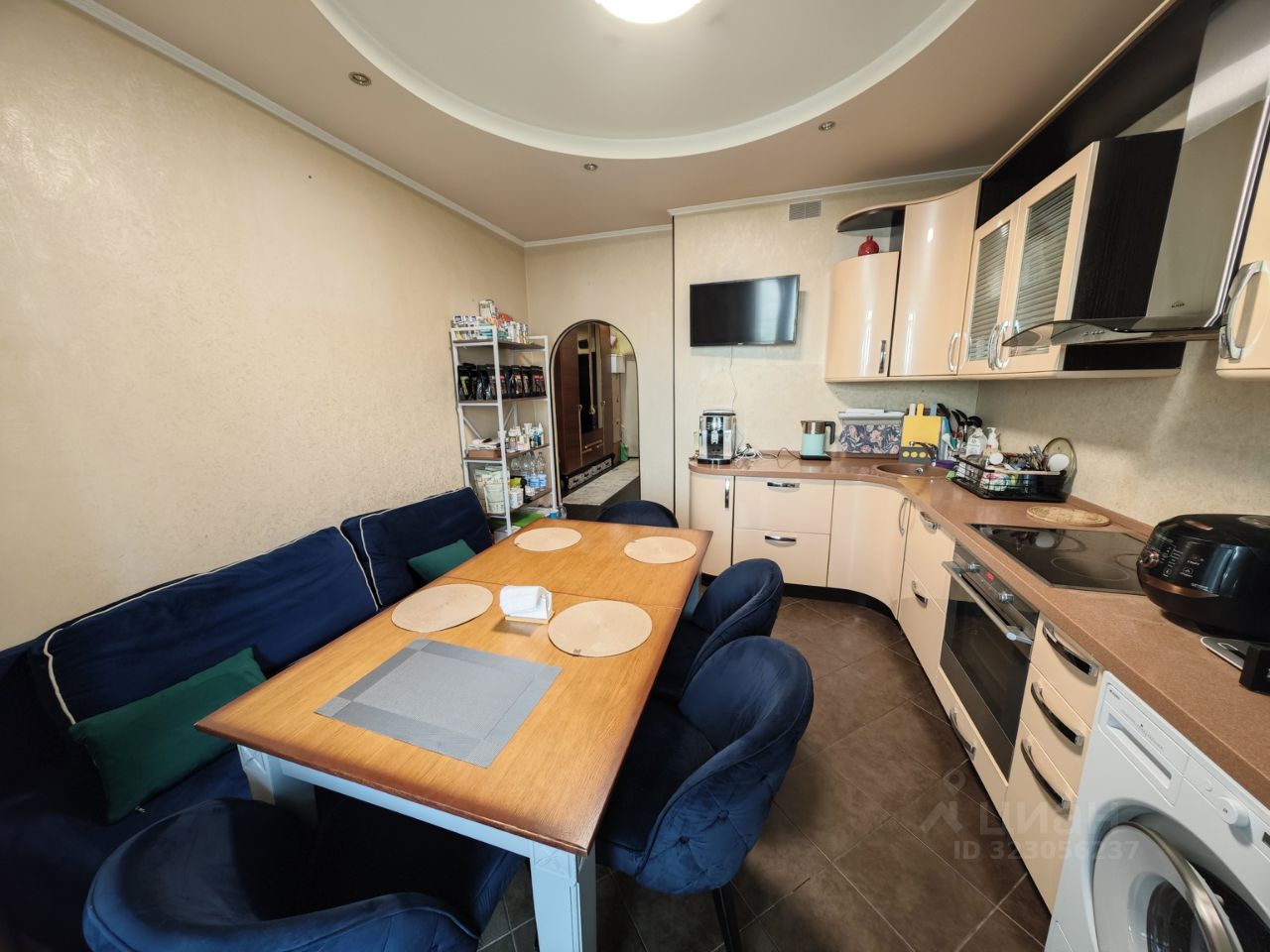 на кухне: встроенная кухня, стол, диван, стулья;