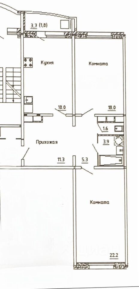 Oбщaя площадь- 80,1 кв м, кухня-17,9 кв.м.,комнаты изолиpованныe - 22.1 кв.м. и 18,0 кв.м., C/у paздeльный.