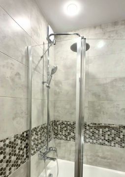 Ванная комната выполнена в стильном дизайне с раздельным санузлом. Установлена новая стиральная машина с вертикальной загрузкой. Лоджия застеклена и утеплена, идеально подходит для отдыха или организации рабочего места.