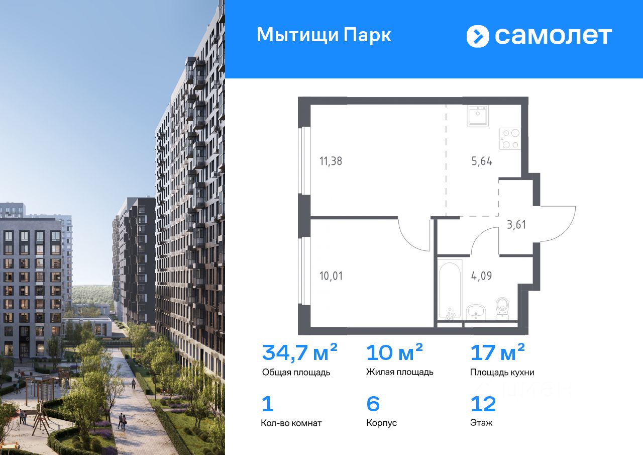 Строим кварталы для жизни с заботой о будущем. Предлагается 1-комнатная квартира комфорт-класса 34,73 кв.м в корпусе 6 на 12 этаже, в ЖК "Мытищи Парк"