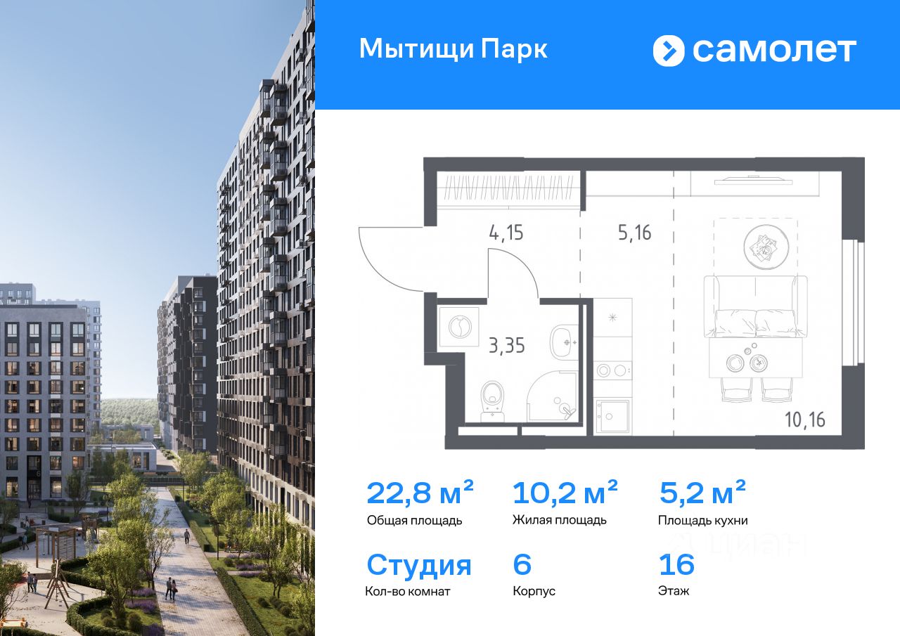 Строим кварталы для жизни с заботой о будущем. Предлагается квартира студия комфорт-класса 22,82 кв.м в корпусе 6 на 16 этаже, в ЖК "Мытищи Парк"