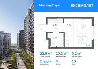 Строим кварталы для жизни с заботой о будущем. Предлагается квартира студия комфорт-класса 22,82 кв.м в корпусе 6 на 10 этаже, в ЖК "Мытищи Парк"