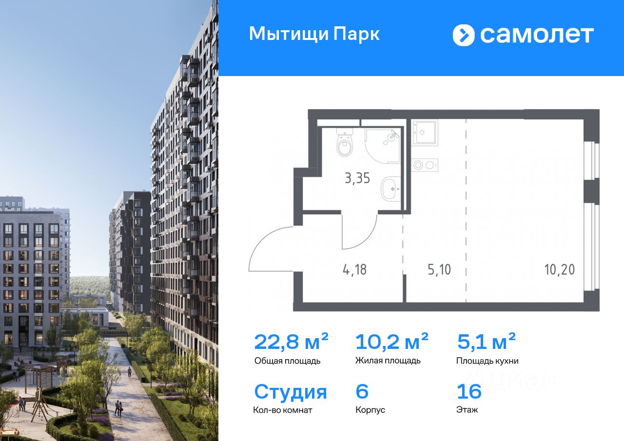 Строим кварталы для жизни с заботой о будущем. Предлагается квартира студия комфорт-класса 22,83 кв.м в корпусе 6 на 16 этаже, в ЖК "Мытищи Парк"