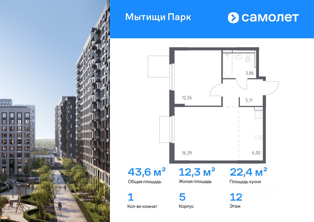 Строим кварталы для жизни с заботой о будущем. Предлагается 1-комнатная квартира комфорт-класса 43,62 кв.м в корпусе 5 на 12 этаже, в ЖК "Мытищи Парк"