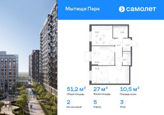 Строим кварталы для жизни с заботой о будущем. Предлагается 2-комнатная квартира комфорт-класса 51,16 кв.м в корпусе 5 на 3 этаже, в ЖК "Мытищи Парк"