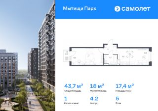Строим кварталы для жизни с заботой о будущем. Предлагается 1-комнатная квартира комфорт-класса 43,7 кв.м в корпусе 4.2 на 5 этаже, в ЖК "Мытищи Парк"