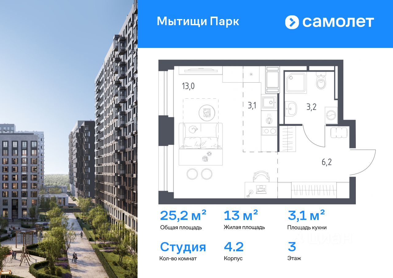 Строим кварталы для жизни с заботой о будущем. Предлагается квартира студия комфорт-класса 25,2 кв.м в корпусе 4.2 на 3 этаже, в ЖК "Мытищи Парк"