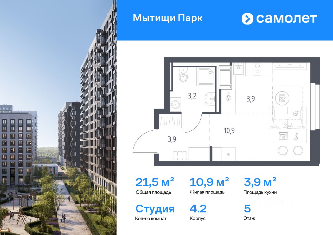 Строим кварталы для жизни с заботой о будущем. Предлагается квартира студия комфорт-класса 21,5 кв.м в корпусе 4.2 на 5 этаже, в ЖК "Мытищи Парк"