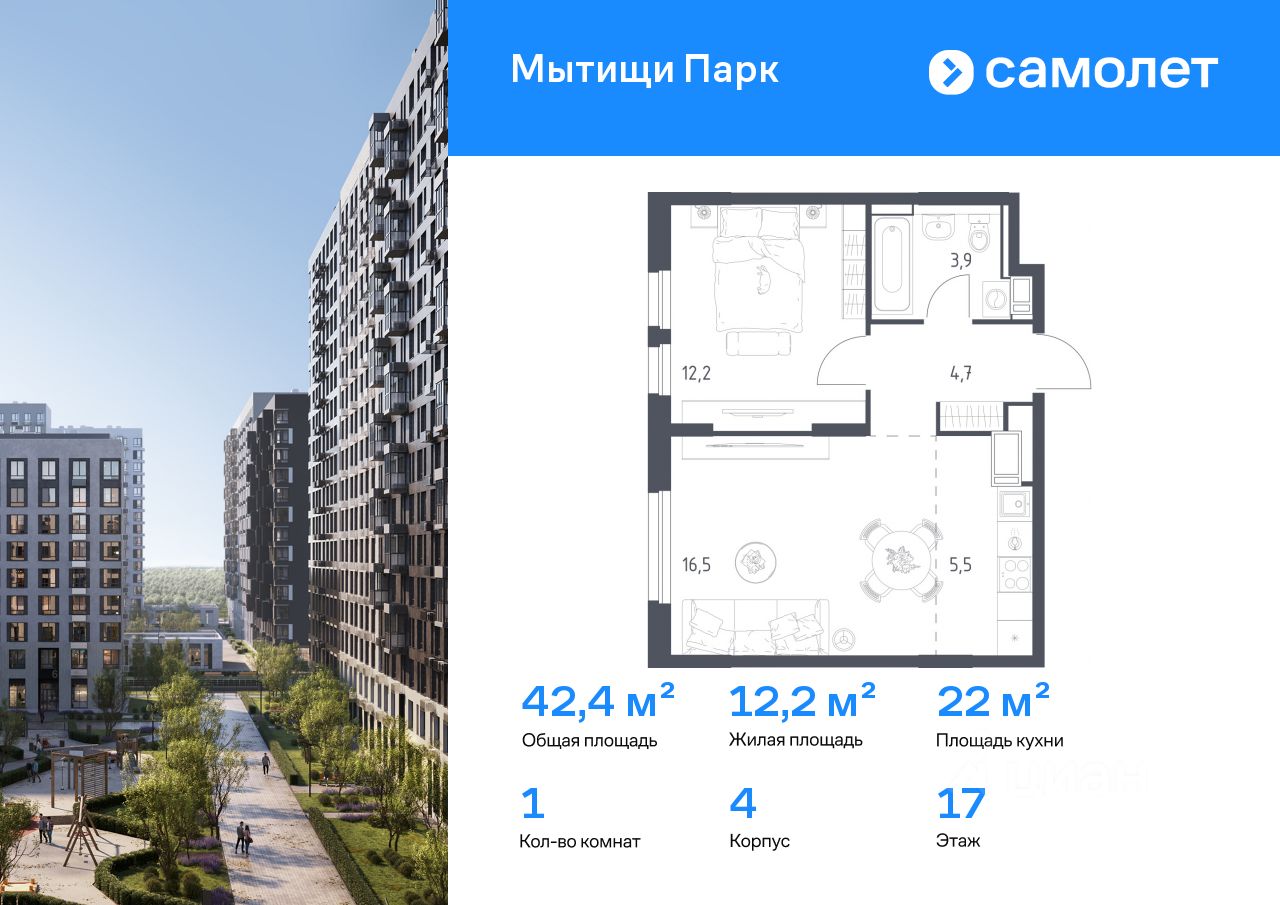 Строим кварталы для жизни с заботой о будущем. Предлагается 1-комнатная квартира комфорт-класса 42,4 кв.м в корпусе 4 на 17 этаже, в ЖК "Мытищи Парк"