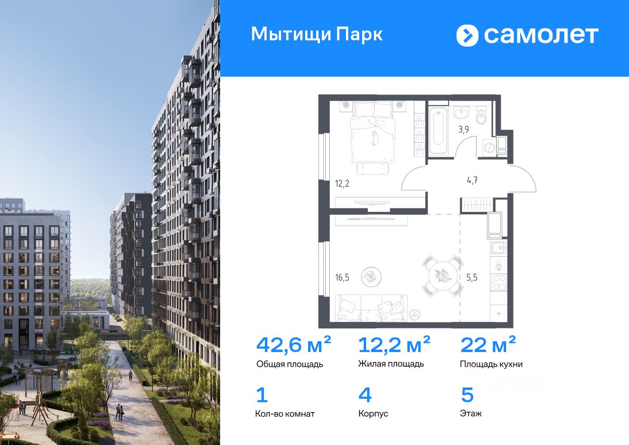 Строим кварталы для жизни с заботой о будущем. Предлагается 1-комнатная квартира комфорт-класса 42,6 кв.м в корпусе 4 на 5 этаже, в ЖК "Мытищи Парк"
