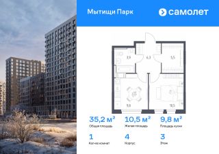 Строим кварталы для жизни с заботой о будущем. Предлагается 1-комнатная квартира комфорт-класса 35,2 кв.м в корпусе 4 на 3 этаже, в ЖК "Мытищи Парк"