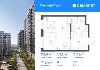 Строим кварталы для жизни с заботой о будущем. Предлагается квартира студия комфорт-класса 25,4 кв.м в корпусе 4 на 17 этаже, в ЖК "Мытищи Парк"