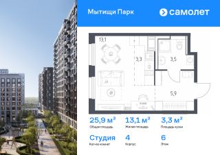 Строим кварталы для жизни с заботой о будущем. Предлагается квартира студия комфорт-класса 25,9 кв.м в корпусе 4 на 6 этаже, в ЖК "Мытищи Парк"