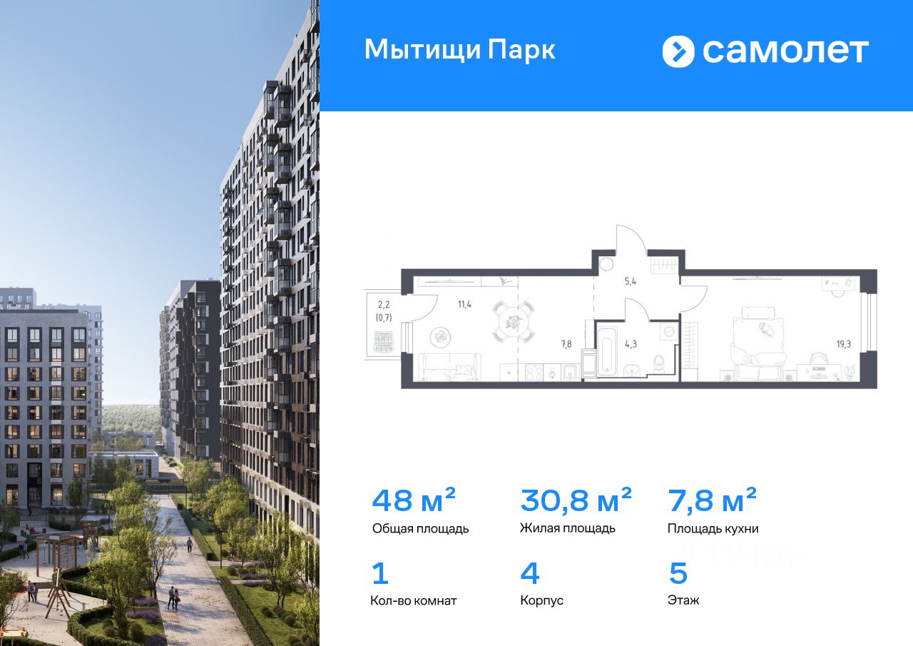 Строим кварталы для жизни с заботой о будущем. Предлагается 1-комнатная квартира комфорт-класса 48 кв.м в корпусе 4 на 5 этаже, в ЖК "Мытищи Парк"