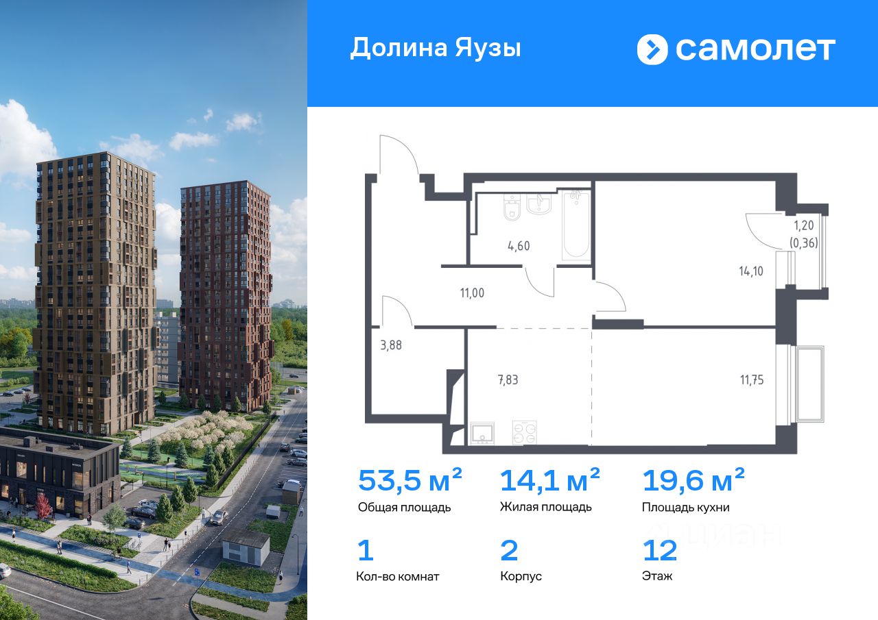 Строим кварталы для жизни с заботой о будущем. Предлагается 1-комнатная квартира комфорт-класса 53,52 кв.м в корпусе 2 на 12 этаже, в ЖК "Долина Яузы"