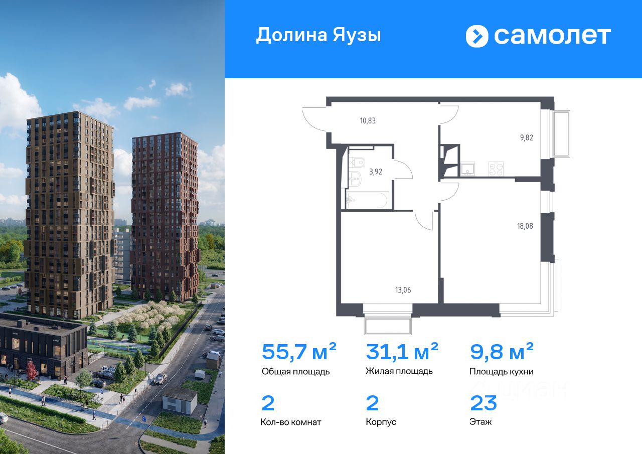 Строим кварталы для жизни с заботой о будущем. Предлагается 2-комнатная квартира комфорт-класса 55,71 кв.м в корпусе 2 на 23 этаже, в ЖК "Долина Яузы"