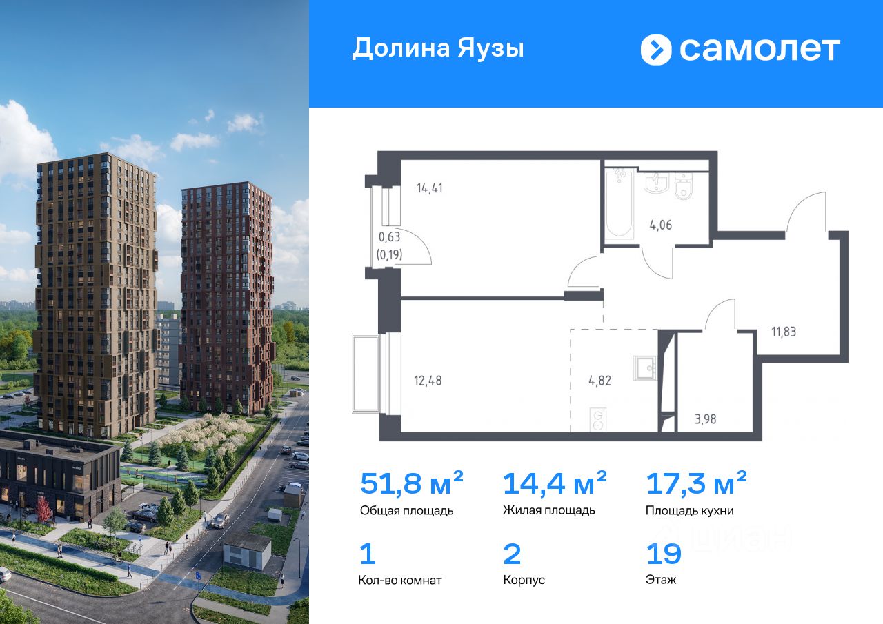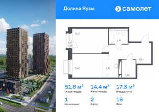Строим кварталы для жизни с заботой о будущем. Предлагается 1-комнатная квартира комфорт-класса 51,77 кв.м в корпусе 2 на 19 этаже, в ЖК "Долина Яузы"