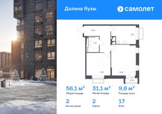 Строим кварталы для жизни с заботой о будущем. Предлагается 2-комнатная квартира комфорт-класса 56,1 кв.м в корпусе 2 на 17 этаже, в ЖК "Долина Яузы"