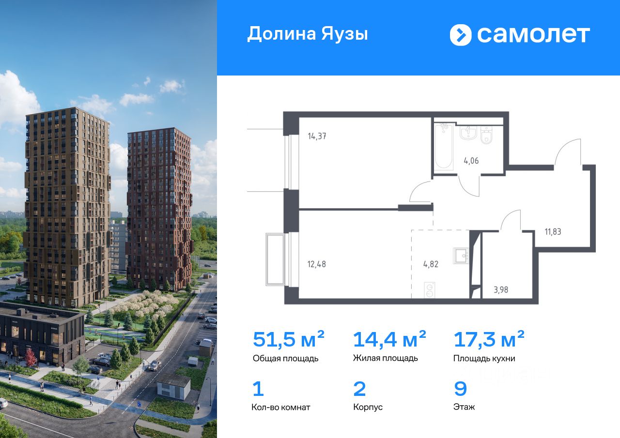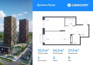 Строим кварталы для жизни с заботой о будущем. Предлагается 1-комнатная квартира комфорт-класса 51,54 кв.м в корпусе 2 на 9 этаже, в ЖК "Долина Яузы"