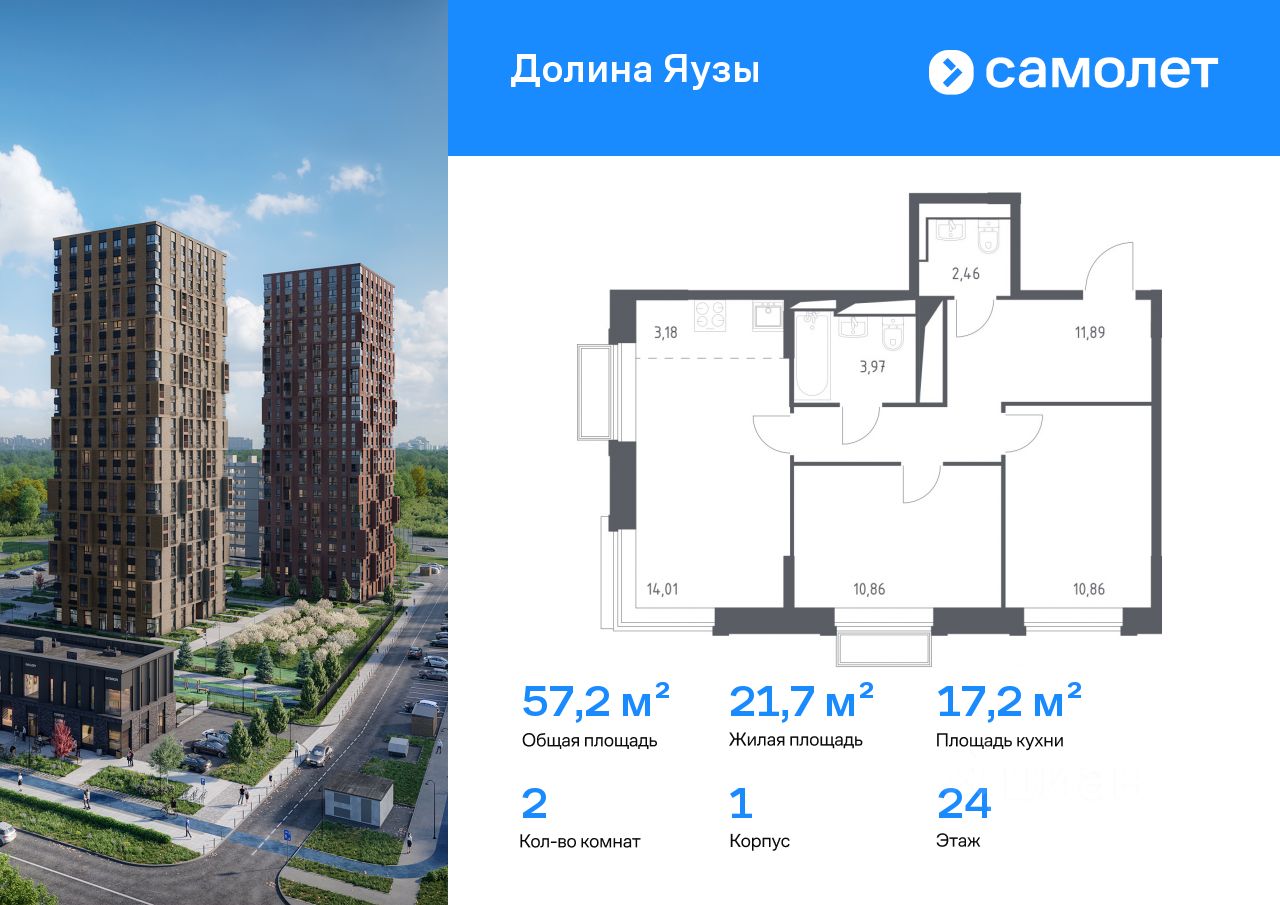 Строим кварталы для жизни с заботой о будущем. Предлагается 2-комнатная квартира комфорт-класса 57,23 кв.м в корпусе 1 на 24 этаже, в ЖК "Долина Яузы"