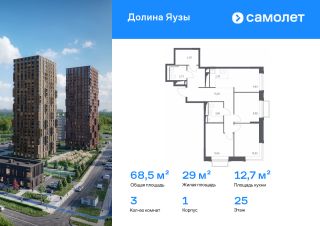Строим кварталы для жизни с заботой о будущем. Предлагается 3-комнатная квартира комфорт-класса 68,48 кв.м в корпусе 1 на 25 этаже, в ЖК "Долина Яузы"