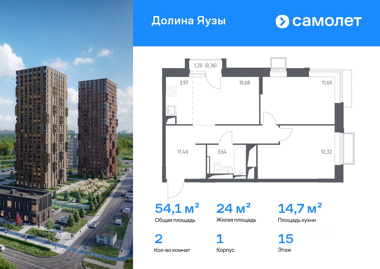 Строим кварталы для жизни с заботой о будущем. Предлагается 2-комнатная квартира комфорт-класса 54,12 кв.м в корпусе 1 на 15 этаже, в ЖК "Долина Яузы"