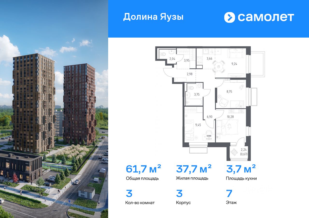 Строим кварталы для жизни с заботой о будущем. Предлагается 3-комнатная квартира комфорт-класса 61,67 кв.м в корпусе 3 на 7 этаже, в ЖК "Долина Яузы"