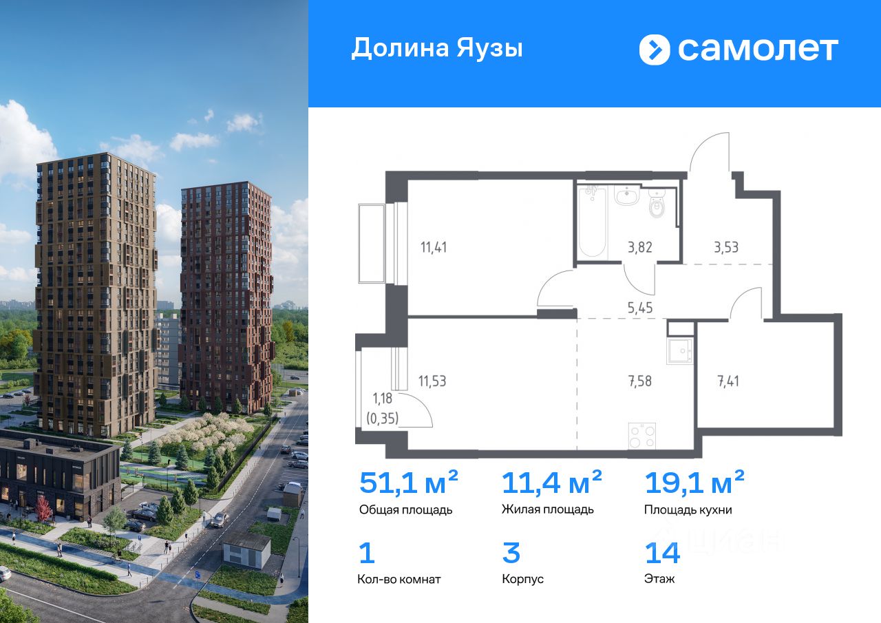 Строим кварталы для жизни с заботой о будущем. Предлагается 1-комнатная квартира комфорт-класса 51,08 кв.м в корпусе 3 на 14 этаже, в ЖК "Долина Яузы"
