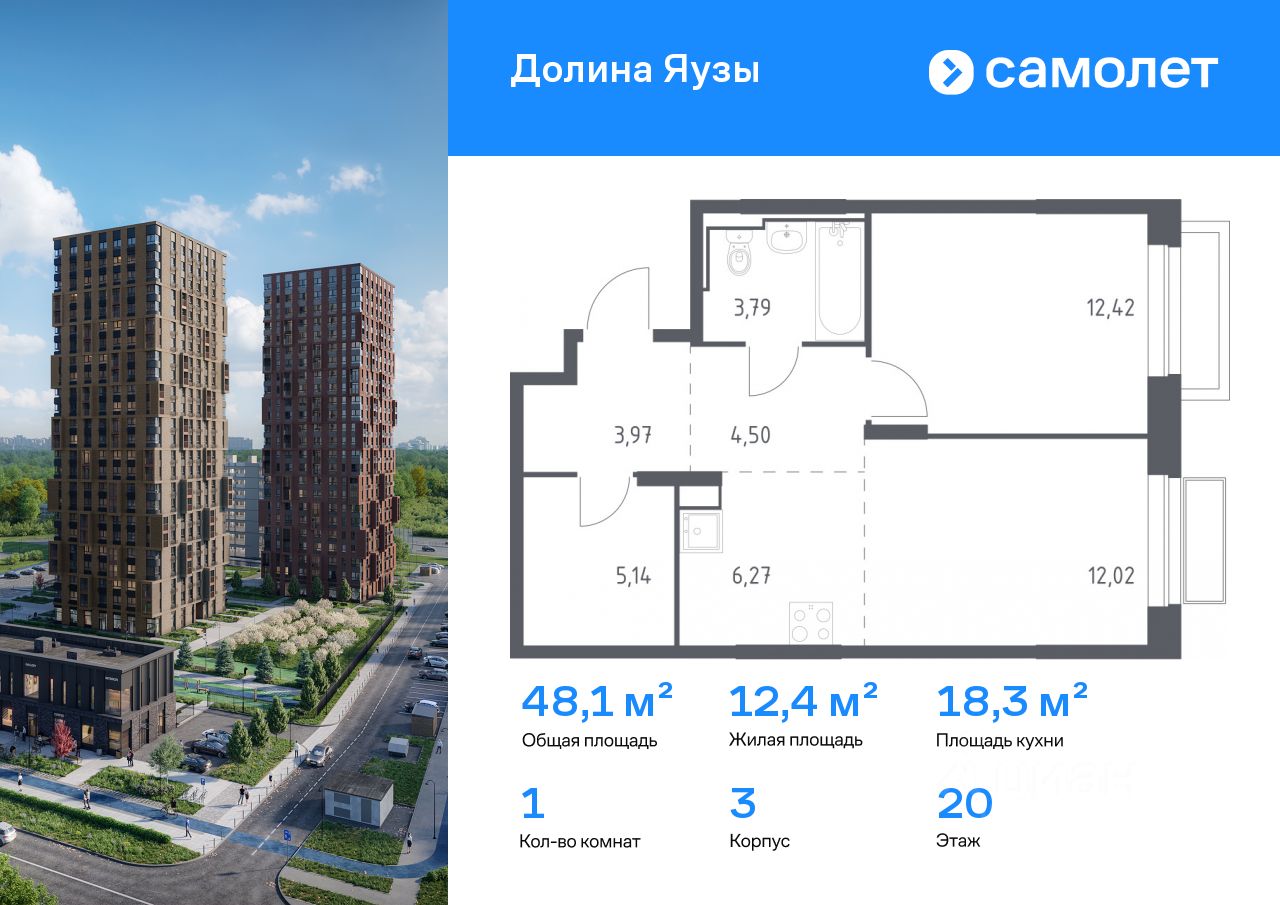 Строим кварталы для жизни с заботой о будущем. Предлагается 1-комнатная квартира комфорт-класса 48,11 кв.м в корпусе 3 на 20 этаже, в ЖК "Долина Яузы"