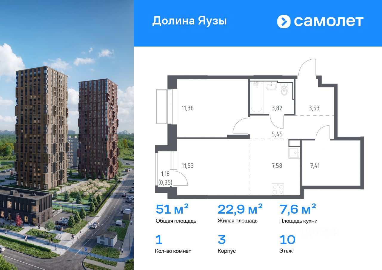 Строим кварталы для жизни с заботой о будущем. Предлагается 1-комнатная квартира комфорт-класса 51,03 кв.м в корпусе 3 на 10 этаже, в ЖК "Долина Яузы"