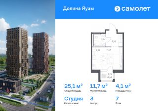 Строим кварталы для жизни с заботой о будущем. Предлагается квартира студия комфорт-класса 25,13 кв.м в корпусе 3 на 7 этаже, в ЖК "Долина Яузы"