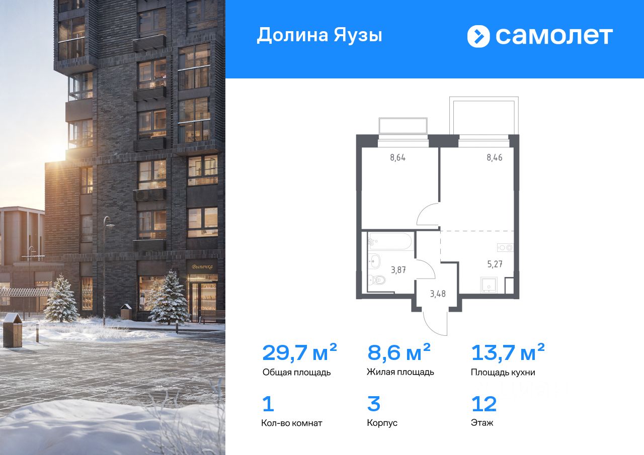 Строим кварталы для жизни с заботой о будущем. Предлагается 1-комнатная квартира комфорт-класса 29,72 кв.м в корпусе 3 на 12 этаже, в ЖК "Долина Яузы"