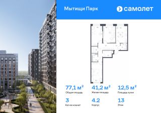 Строим кварталы для жизни с заботой о будущем. Предлагается 3-комнатная квартира комфорт-класса 77,1 кв.м в корпусе 4.2 на 13 этаже, в ЖК "Мытищи Парк"