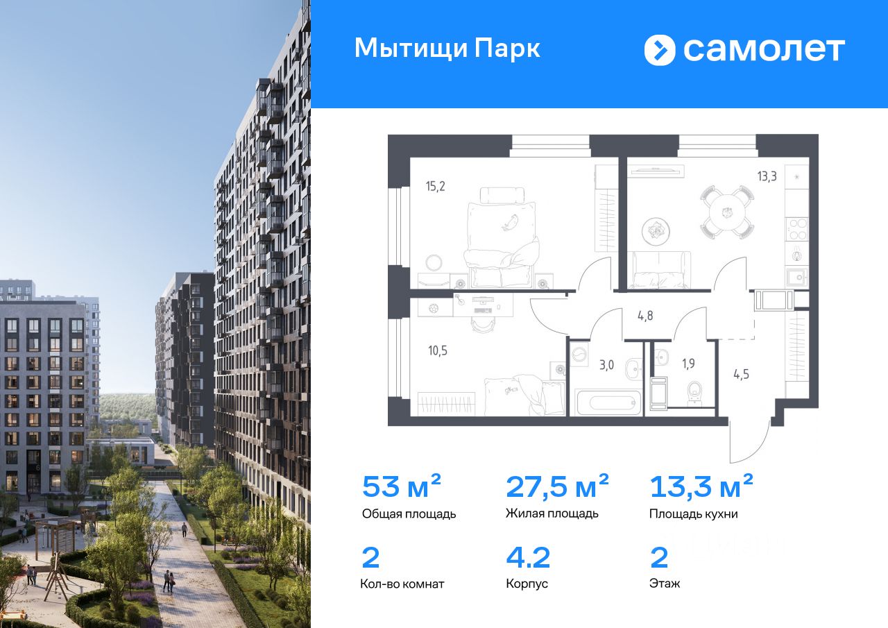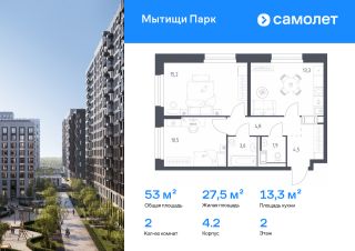 Строим кварталы для жизни с заботой о будущем. Предлагается 2-комнатная квартира комфорт-класса 53 кв.м в корпусе 4.2 на 2 этаже, в ЖК "Мытищи Парк"